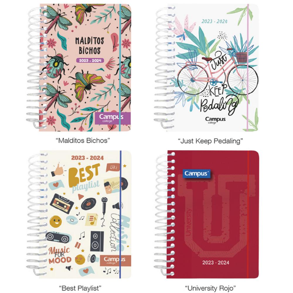 Agenda escolar Día Página en tamaño A5 (140×195 mm). 160 hojas. Tapas de polipropileno impresas a todo color. Cierre de goma redonda. 4 diseños de cubierta diferentes. Espiral Coil Lock de plástico transparente. Con 4 páginas de pegatinas. Diseño interior Fantasía.