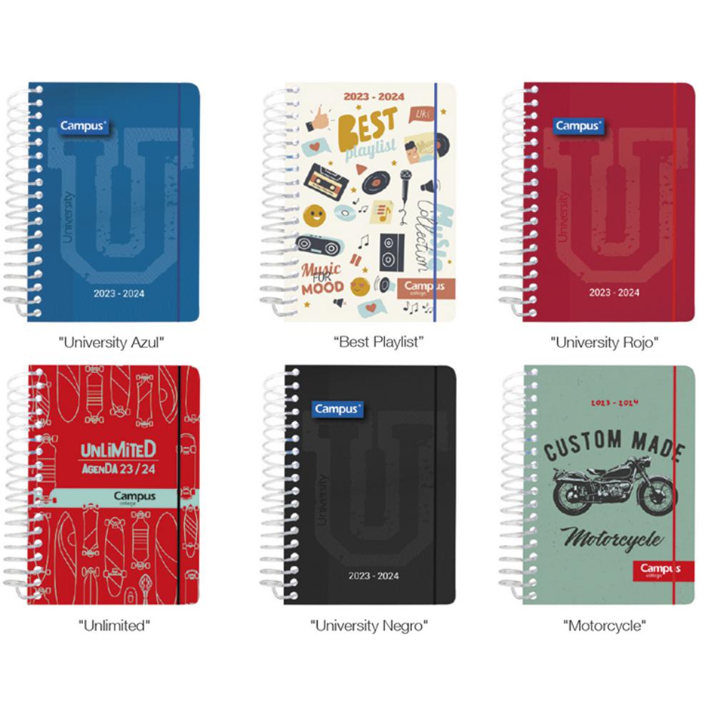 Agenda escolar Día Página en tamaño A6+ (115×168 mm). 160 hojas. Tapas de polipropileno impresas a todo color. Cierre de goma redonda. 6 diseños de cubierta diferentes. Espiral Coil Lock de plástico transparente. Con 4 páginas de pegatinas. Diseño interior Estandar.
