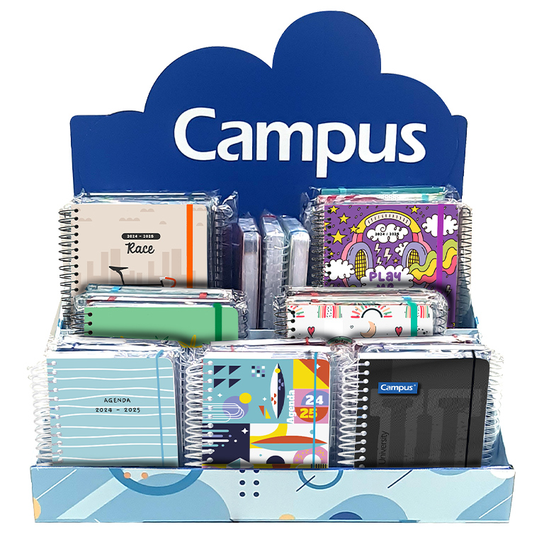 Expositor de 46 Agendas escolares Campus en tamaño A6+ y A5, Día Página y SemanaVista. Contenido: 003482 (6 unid), 003483 (6 unid), 003484 (4 unid), 003481 (6 unid), 003485 (4 unid), 003486 (4 unid), 003487 (4 unid), 003489 (4 unid), 003490 (4 unid) y 003491 (4 unid).