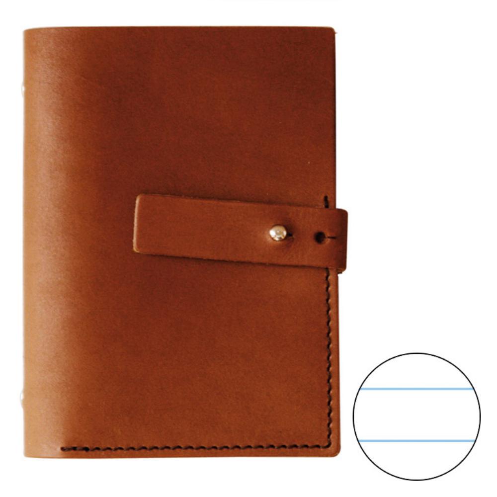 Agenda de piel con portatarjetas y portabolígrafos interior. Con cierre de broche. Color marrón oscuro. Rayado horizontal. Medidas: 135 x 190 x 20 mm.