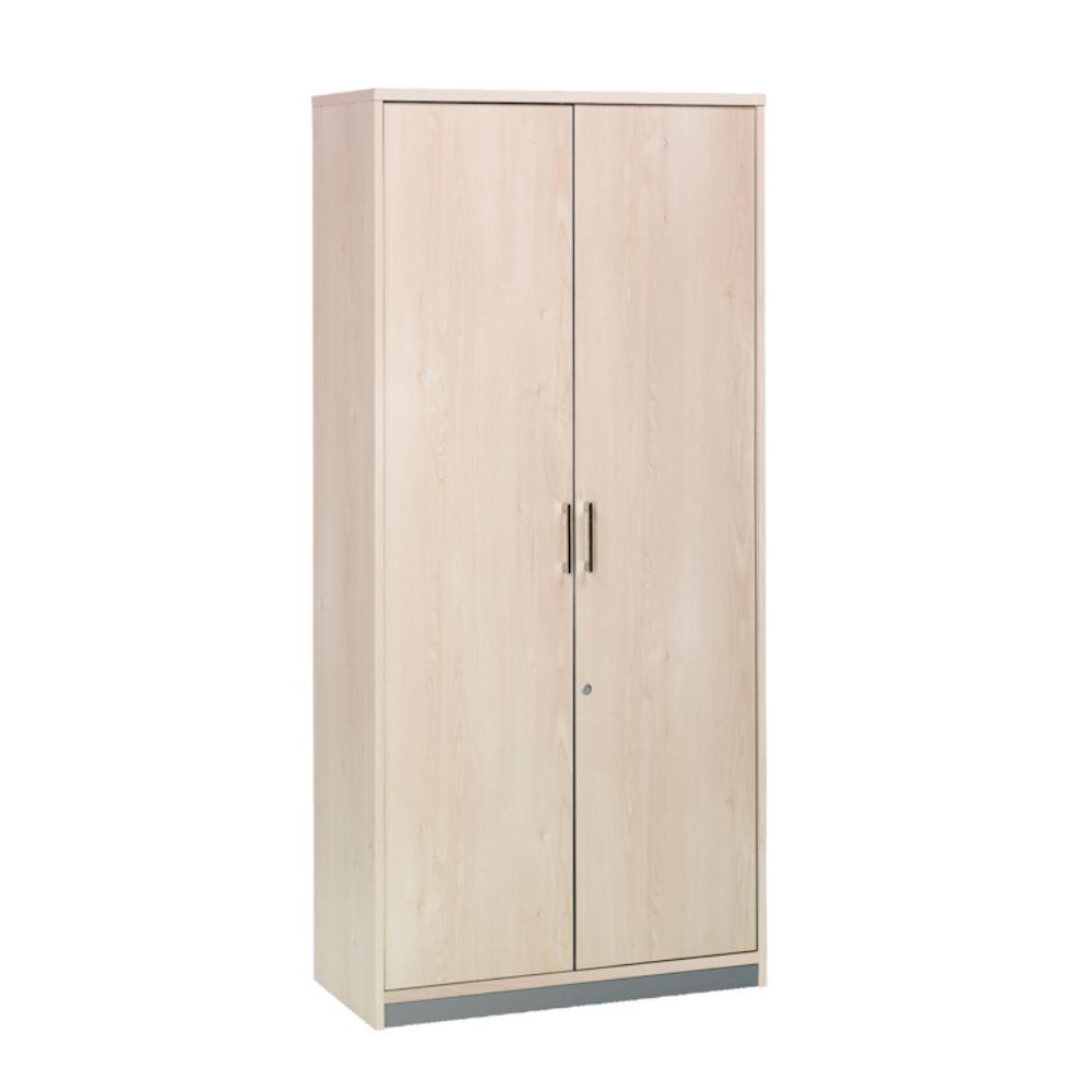 Estructura con sistema de regulación independiente, de aglomerado de 25 y 19 mm de grosor con canto de PVC de 2 mm. Los distintos agujeros permiten la fijación de diferentes opciones: puertas, carpeteros y estantes. Sistema de cierre y antivuelco en carpeteros. Traseras en color gris por ambos lados. Armario alto con dos puertas. Tiene 5 estantes. Medidas (An x Prof x Al): 90 x 45 x 195 cm. Color: haya / haya.