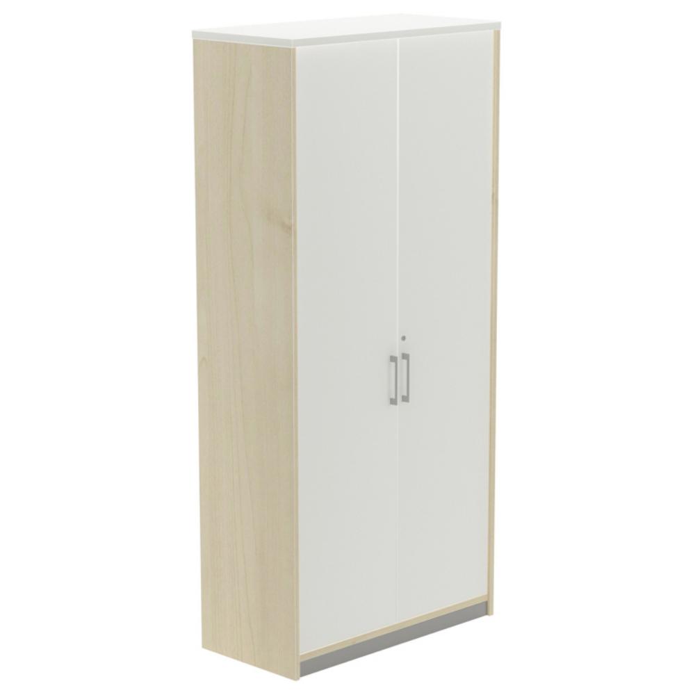 Estructura con sistema de regulación independiente, de aglomerado de 25 y 19 mm de grosor con canto de PVC de 2 mm. Los distintos agujeros permiten la fijación de diferentes opciones: puertas, carpeteros y estantes. Sistema de cierre y antivuelco en carpeteros. Traseras en color gris por ambos lados. Armario alto con dos puertas. Tiene 5 estantes. Medidas (An x Prof x Al): 90 x 45 x 195 cm. Color: haya / blanco.