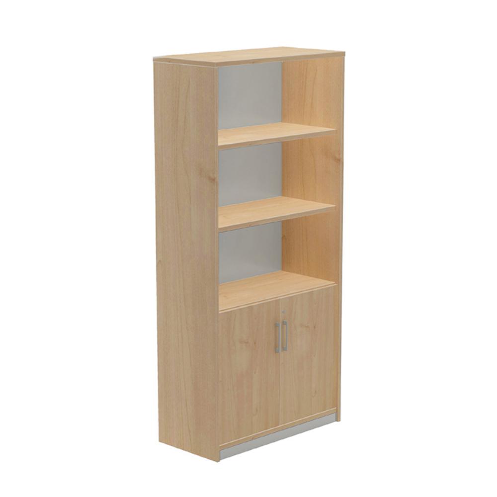 Estructura con sistema de regulación independiente, de aglomerado de 25 y 19 mm de grosor con canto de PVC de 2 mm. Los distintos agujeros permiten la fijación de diferentes opciones: puertas, carpeteros y estantes. Sistema de cierre y antivuelco en carpeteros. Traseras en color gris por ambos lados. Armario alto con puertas bajas. Tiene 5 estantes. Medidas (An x Prof x Al): 90 x 45 x 195 cm. Color: roble / roble.