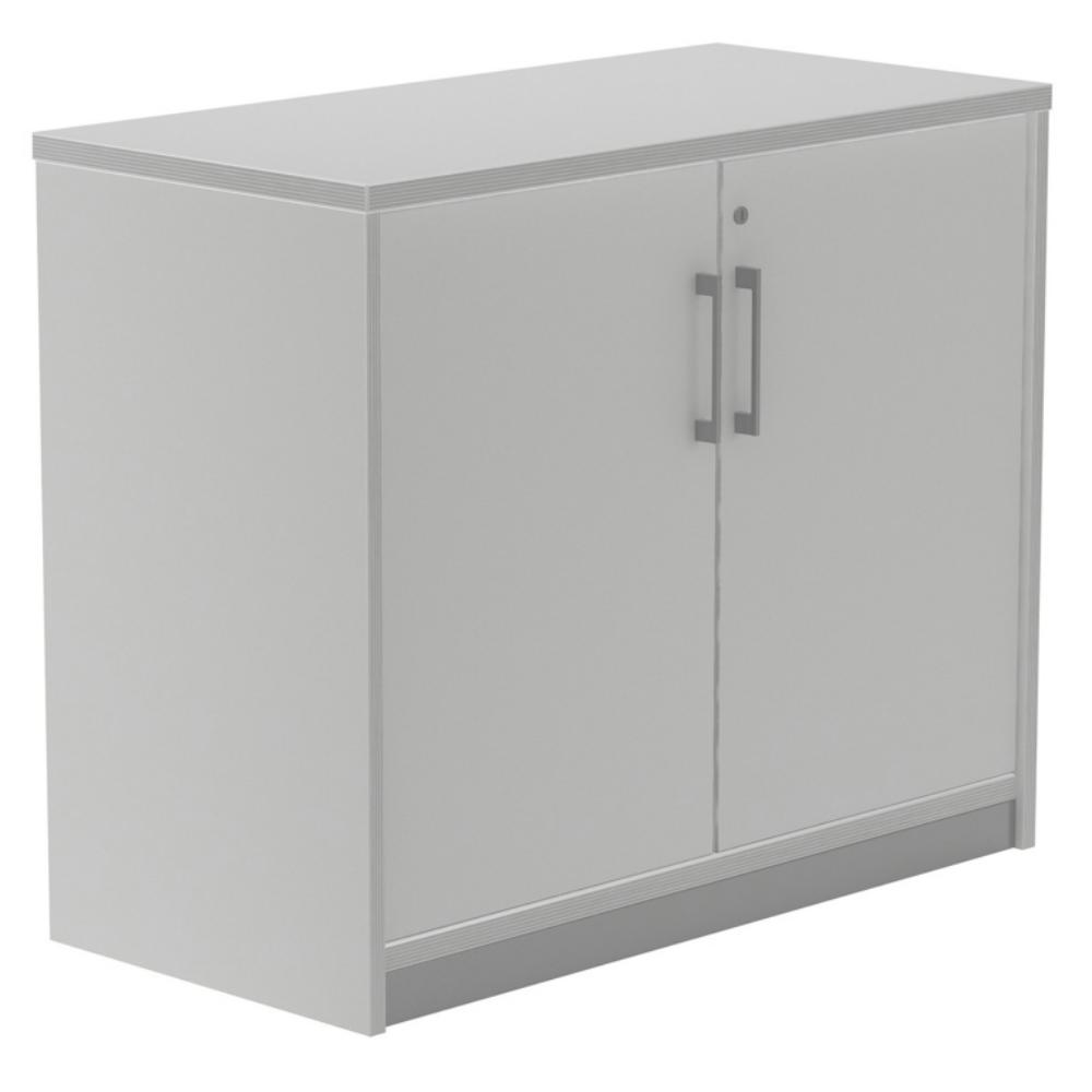 Estructura con sistema de regulación independiente, de aglomerado de 25 y 19 mm de grosor con canto de PVC de 2 mm. Los distintos agujeros permiten la fijación de diferentes opciones: puertas, carpeteros y estantes. Sistema de cierre y antivuelco en carpeteros. Traseras en color gris por ambos lados. Armario bajo con dos puertas. Tiene 2 estantes. Medidas (An x Prof x Al): 90 x 45 x 78 cm. Color: aluminio / gris.