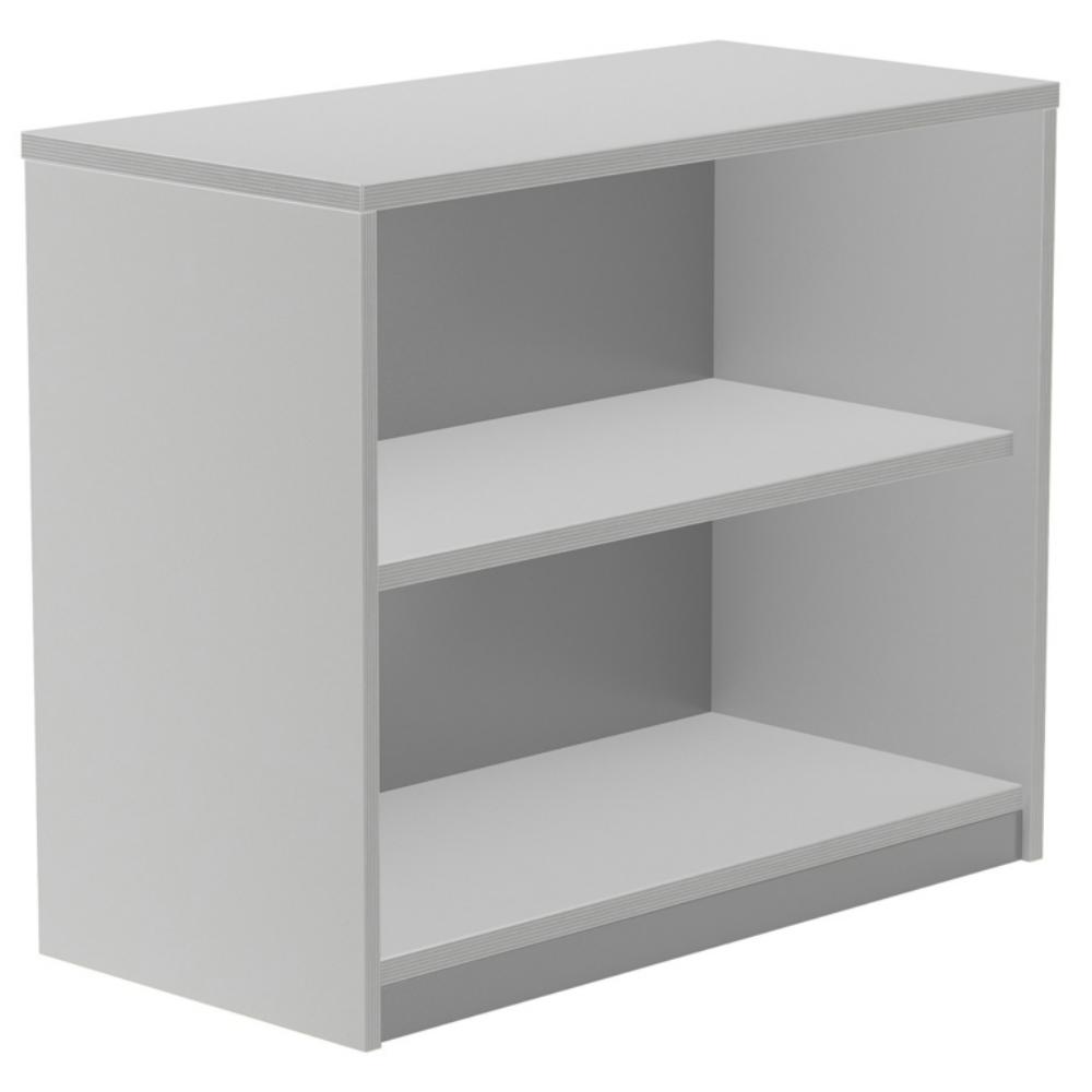 Estructura con sistema de regulación independiente, de aglomerado de 25 y 19 mm de grosor con canto de PVC de 2 mm. Los distintos agujeros permiten la fijación de diferentes opciones: puertas, carpeteros y estantes. Sistema de cierre y antivuelco en carpeteros. Traseras en color gris por ambos lados. Armario bajo sin puertas. Tiene 2 estantes. Medidas (An x Prof x Al): 90 x 45 x 78 cm. Color: aluminio / gris.