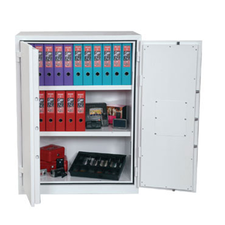 Protege documentos en soporte papel de la acción del fuego hasta 500º. Probada según la prestigiosa norma europea de seguridad S2 EN 14450, con una cobertura de efectivo de 2.000¤ y una cobertura de objetos de valor de 25.000¤. Sus cerrojos de alta seguridad de 3 vías proporcionan una gran solidez y resistencia a los ataques. Suministrado con estantes ajustables en altura. Incluye también de serie raíles de enganche para archivos laterales. Preparada para fijar al suelo con los pernos que se suministran. Acabado de alta calidad resistente a arañazos. Equipada con cerradura de llave de doble paletón de alta seguridad VdS clase I. Medidas: 1080 x 815 x 410 mm.