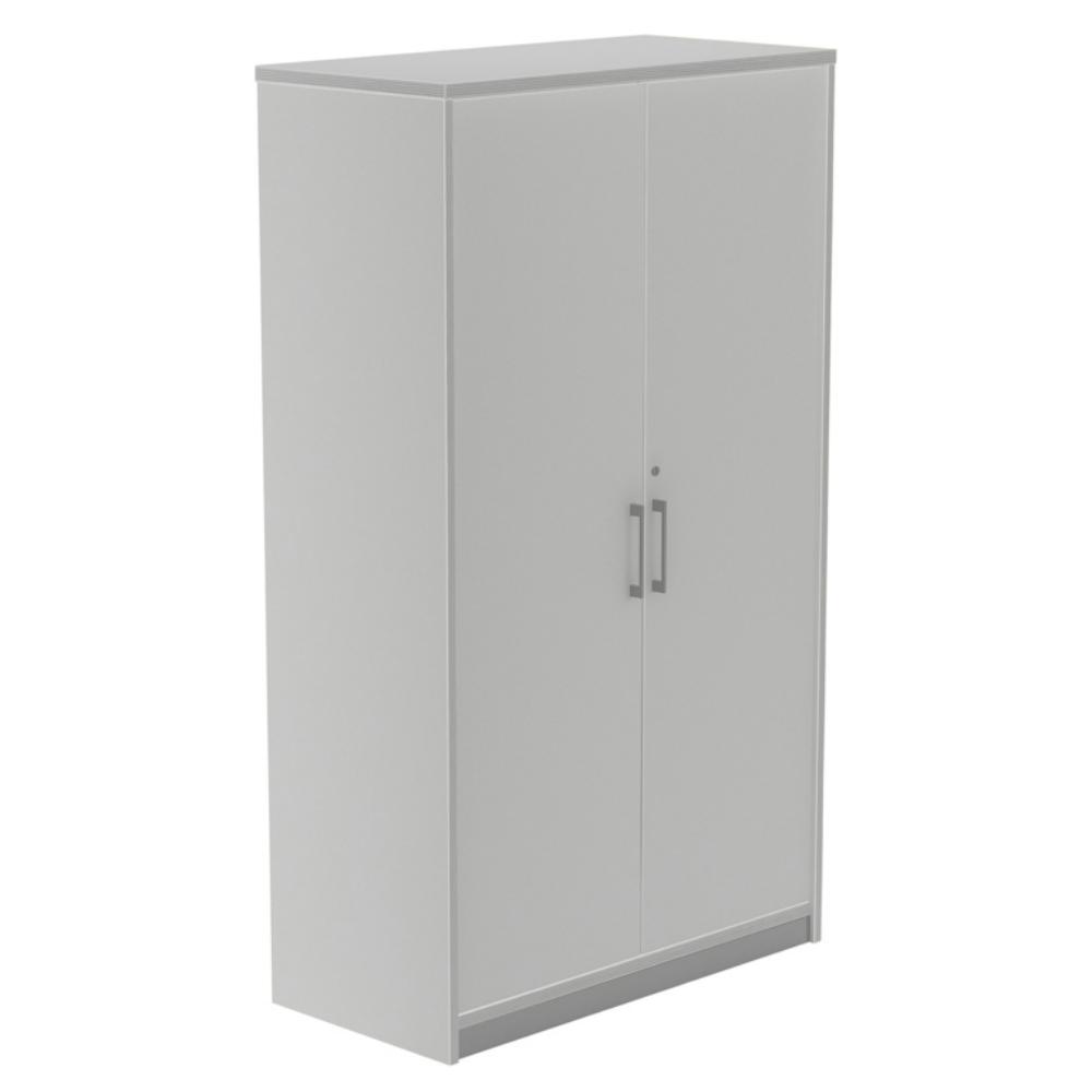 Estructura con sistema de regulación independiente, de aglomerado de 25 y 19 mm de grosor con canto de PVC de 2 mm. Los distintos agujeros permiten la fijación de diferentes opciones: puertas, carpeteros y estantes. Sistema de cierre y antivuelco en carpeteros. Traseras en color gris por ambos lados. Armario medio con dos puertas. Tiene 4 estantes. Medidas (An x Prof x Al): 90 x 45 x 156 cm. Color: aluminio / gris.