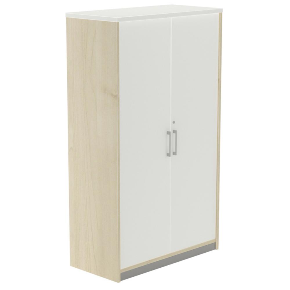 Estructura con sistema de regulación independiente, de aglomerado de 25 y 19 mm de grosor con canto de PVC de 2 mm. Los distintos agujeros permiten la fijación de diferentes opciones: puertas, carpeteros y estantes. Sistema de cierre y antivuelco en carpeteros. Traseras en color gris por ambos lados. Armario medio con dos puertas. Tiene 4 estantes. Medidas (An x Prof x Al): 90 x 45 x 156 cm. Color: haya / blanco.