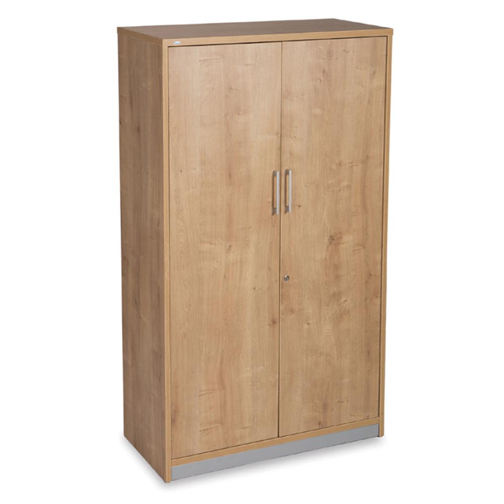 Estructura con sistema de regulación independiente, de aglomerado de 25 y 19 mm de grosor con canto de PVC de 2 mm. Los distintos agujeros permiten la fijación de diferentes opciones: puertas, carpeteros y estantes. Sistema de cierre y antivuelco en carpeteros. Traseras en color gris por ambos lados. Armario medio con dos puertas. Tiene 4 estantes. Medidas (An x Prof x Al): 90 x 45 x 156 cm. Color: roble / roble.