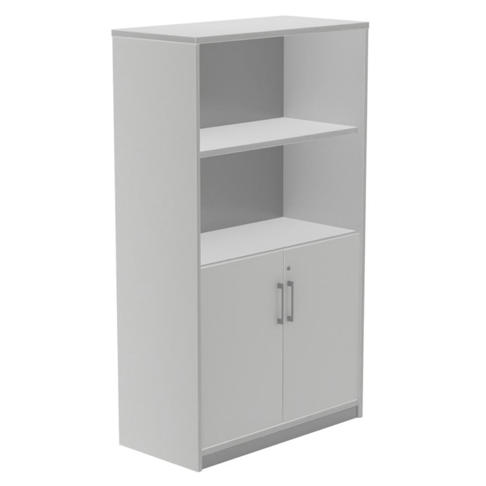 Estructura con sistema de regulación independiente, de aglomerado de 25 y 19 mm de grosor con canto de PVC de 2 mm. Los distintos agujeros permiten la fijación de diferentes opciones: puertas, carpeteros y estantes. Sistema de cierre y antivuelco en carpeteros. Traseras en color gris por ambos lados. Armario medio con dos puertas bajas. Tiene 4 estantes. Medidas (An x Prof x Al): 90 x 45 x 156 cm. Color: aluminio / gris.