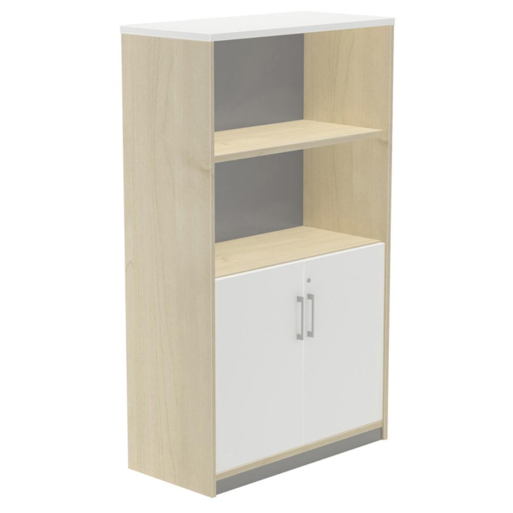 Estructura con sistema de regulación independiente, de aglomerado de 25 y 19 mm de grosor con canto de PVC de 2 mm. Los distintos agujeros permiten la fijación de diferentes opciones: puertas, carpeteros y estantes. Sistema de cierre y antivuelco en carpeteros. Traseras en color gris por ambos lados. Armario medio con dos puertas bajas. Tiene 4 estantes. Medidas (An x Prof x Al): 90 x 45 x 156 cm. Color: haya / blanco.