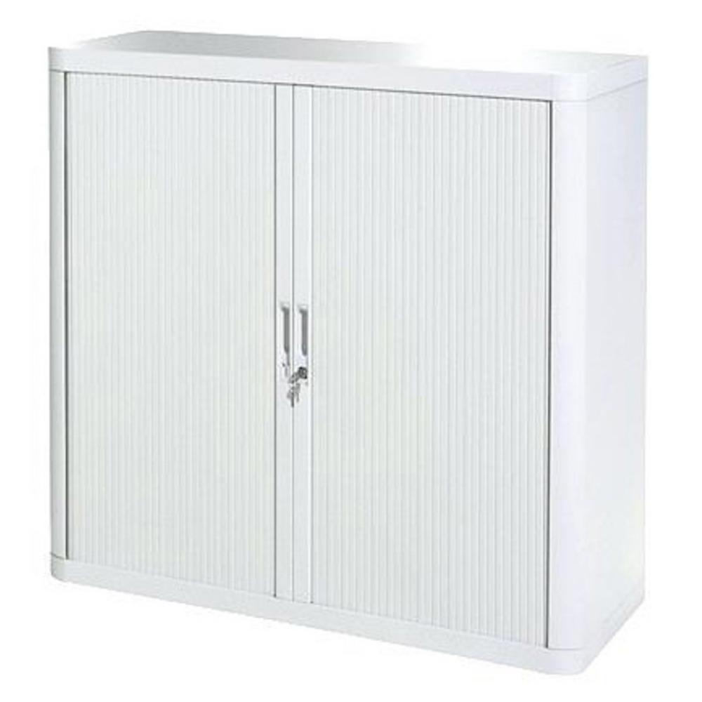 Estructura metálica, cuerpo en poliestireno resistente. Persiana de PVC y manilla integrada. Cerradura de doble salida, con un juego de dos claves numeradas. Estantes metálicoa negros preparados para carpetas colgantes A4. Se suministra sin montar. Fácil montaje en 2 minutos sin herramientas. 5 años de garantía. Armario de 104 cm de altura de 2 estantes. Color: blanco. Medidas (An x Al x Prof): 110 x 104 x 41 cm.