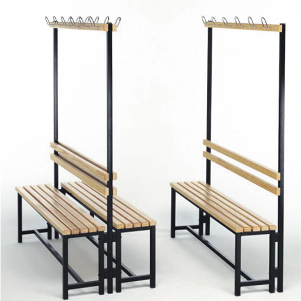 Banco con perchero y respaldo, estructura en tubo de acero, asiento, perchero y respaldo en listones de pino o fenólico. Perchas de varilla cromada. Medidas (An x Al x Prof): 150 x 186 x 30 cm.