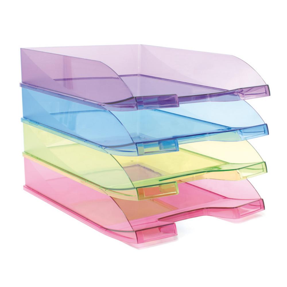 Diseño brillante. Fabricadas en poliestireno de alto impacto. Apilable. Compatible folio y A4. Dimensiones: 256 x 348 x 66 mm. color: azul traslúcido.