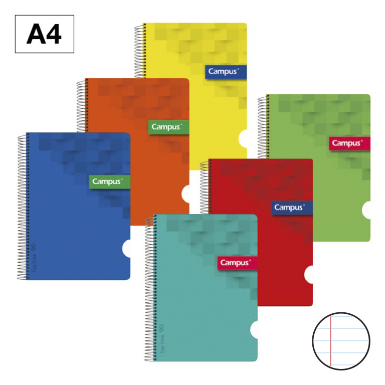 Bloc de espiral con tapa de polipropileno. Contiene 80 hojas de 90 gramos. Cubierta de colores surtidos. Tamaño A4. Medidas: 210 x 297 mm. Rayado: horizontal doble margen.