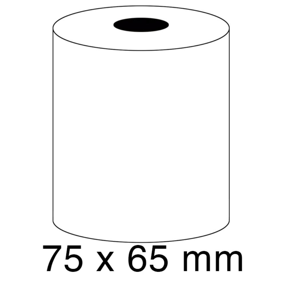 Bobinas de papel para sumadora. Papel Offset blanco. Distintas medidas para las diferentes máquinas. Mandril: 12 mm. Papel 1 copia (2 hojas). Ancho 75 mm. Diámetro 65 mm. Envase 10 unid.