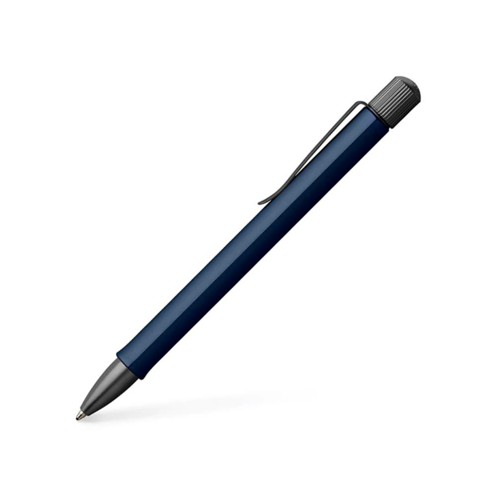 Bolígrafo HEXO negro. Bolígrafo con mecanismo de medio giro: recambio negro, trazo B. Cuerpo hexagonal y capuchón de aluminio anodizado en azul. Zona de agarre ergonómica para una escritura cómoda. Clip macizo de metal con muelle, lacado en azul.