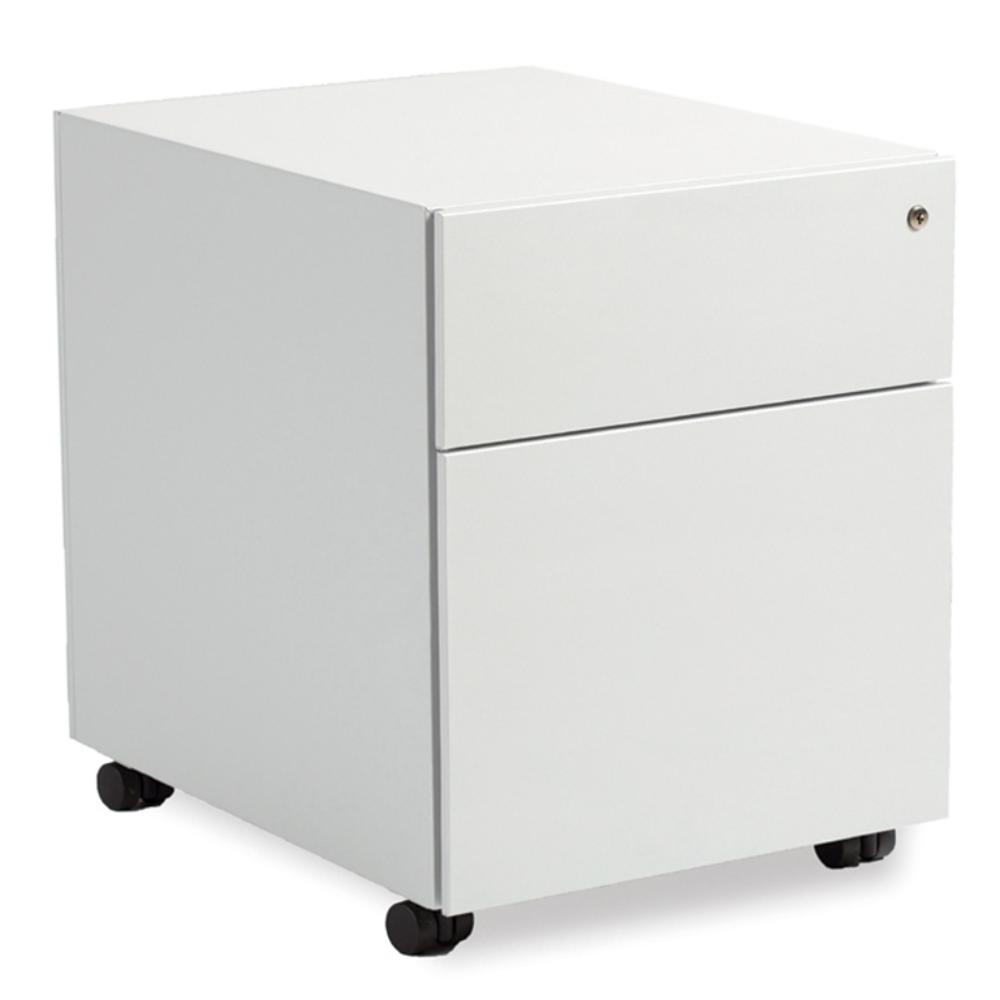 Cajonera metálica con ruedas. Cerradura con dos llaves. Sistema antivuelco. Las ruedas disponen de sistema de freno. Cajones metálicos realizados en chapa de acero. Sistema de cierre centralizado. Guías metálicas con rodamientos de nylon. Tiene un cajón y un carpetero. Medidas: 53 x 42,5 x 58 cm. Color: blanco.