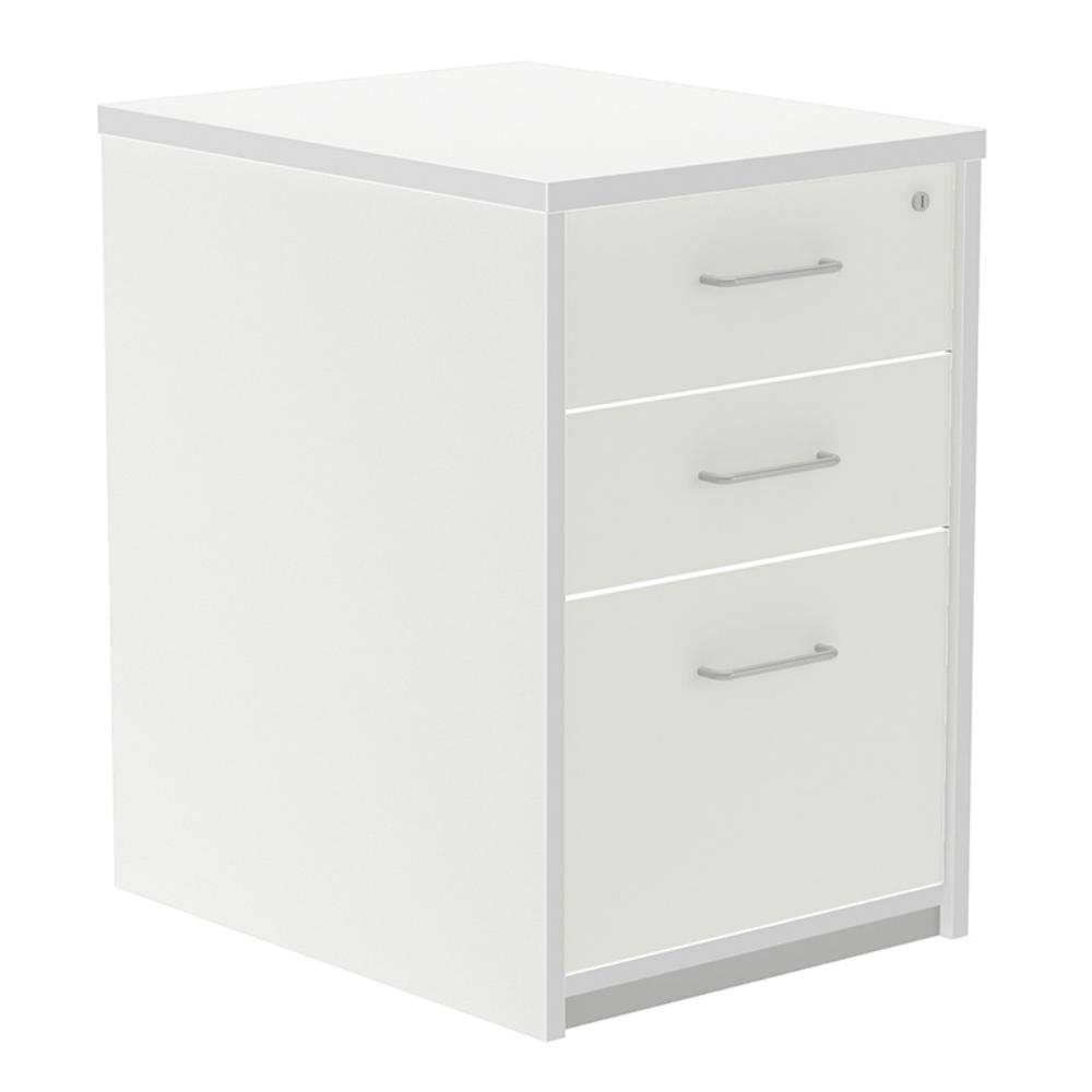 Estructura realizada en melamina de 19 mm en su totalidad. Cerradura con 2 llaves plegables. Sistema de cierre centralizado para la confidencialidad deseada. Sistema antivuelco. Tiradores metálicos. Cajones metálicos realizados en chapa de acero. Guías metálicas con rodamientos de nylon. Tiene 2 cajones y 1 carpetero. Medidas: 60 x 47 x 72 cm. Color de la estructura: blanco. Color de los cajones: blanco.