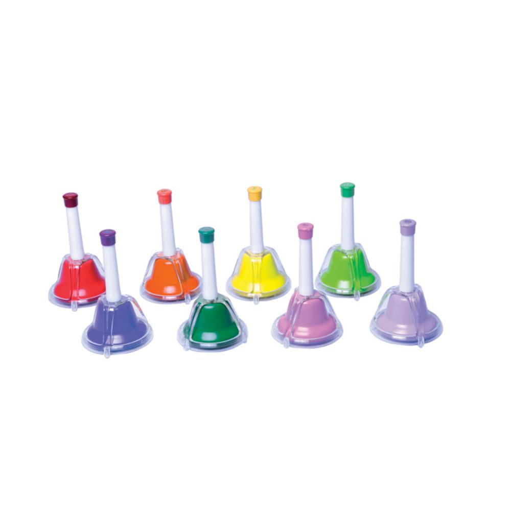 Conjunto de 8 campanitas musicales perfectamente afinadas. Escala diatónica. Novedoso sistema doble de percusión, mediante mango tradicional y pulsación. Incluye librito musical.