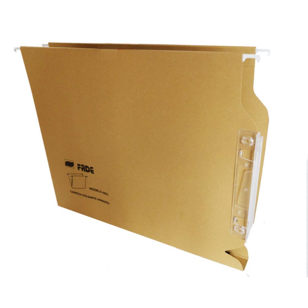Carpeta de cartulina kraft de 220 gr, como lomo de 20 mm reforzado y varilla metálica resistente. Visor lateral. Medidas: 274 x 330 x 335 mm. Contenido: 25 unidades.