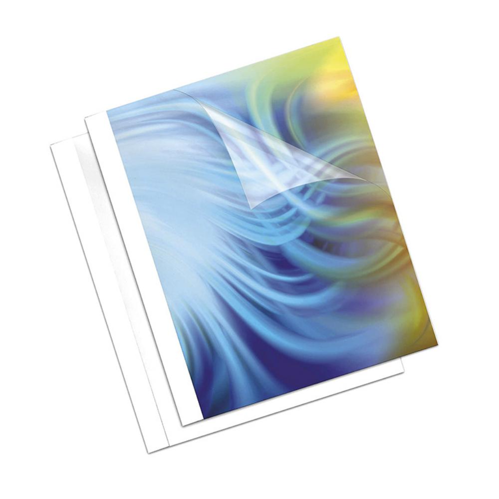 Tapas para encuadernación térmica color blanco A4. Con portadas de PVC transparente de 150 micras y contraportada blanca de cartón brillante de 200 g. Lomo 8 mm. Capacidad de hasta 80 hojas. 100 unidades.