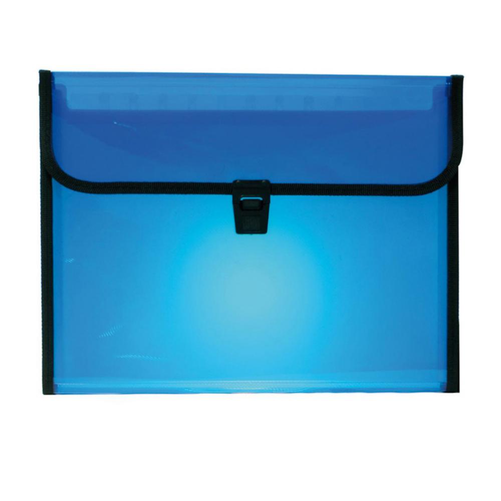 Clasificador con broche. Carpeta clasificadora fabricada en polipropileno. Con 12 compartimentos. Con borde de tela. Medidas: 330 x 250 mm. Color: azul.