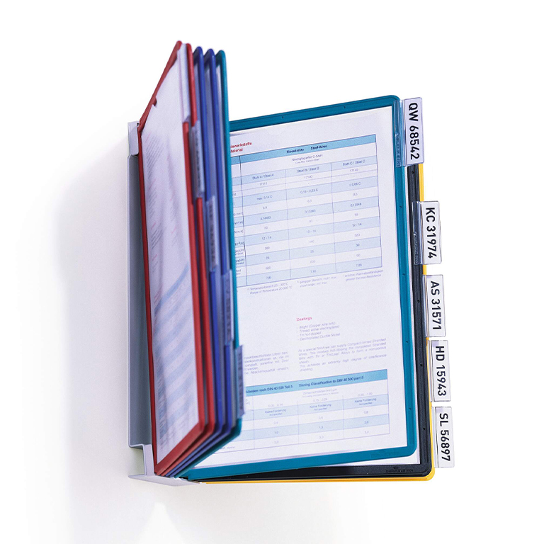Soporte de pared con 10 fundas SHERPA en formato A4, 2 uds. respectivamente en negro, rojo, amarillo, verde y azul marino. Fundas de polipropileno con marco deperfil de color y antirreflectantes, aptas para escanear. Incluye visores con etiquetas intercambiables en blanco para rotulación de las fundas.