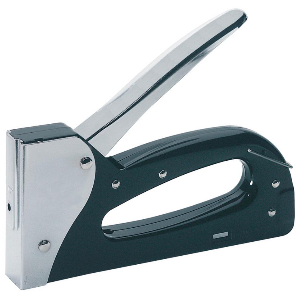 Fiable y segura. Clavadora y mecanismo metálico. Manual. Palanca plegable. Cierre de seguridad. Capacidad para 100 grapas. Utiliza grapas tipo 23/8 y 24/6. Color: negro / plata.