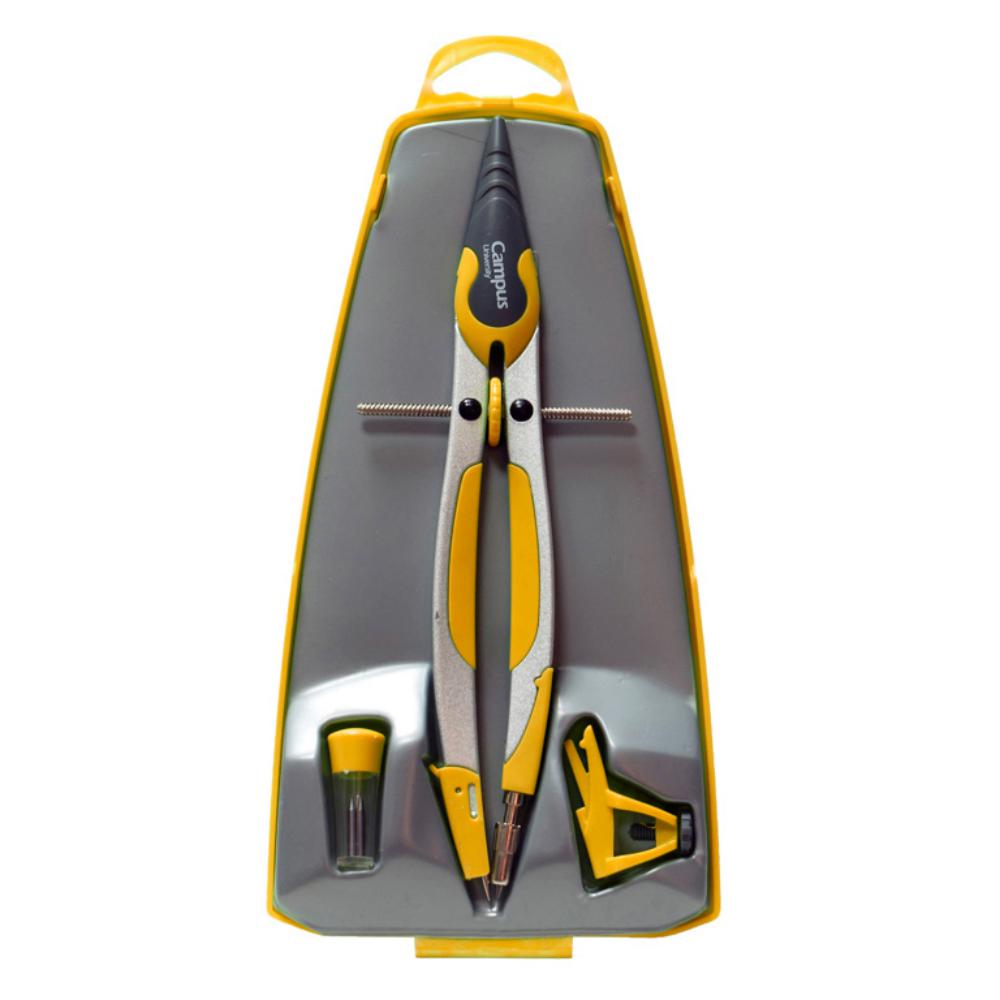 Compás de ajuste rápido y preciso, sin articulación. Apertura con bigotera. Incluye adaptador universal y tubo con 2 minas de repuesto de 2 mm. Se presenta en estuche de plástico con colgador y tapa transparente abatible. Longitud: 17 cm. Es capaz de trazar una circunferencia de 19,5 cm. Color: naranja.