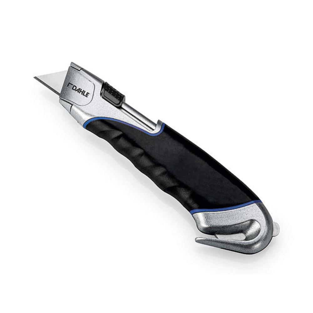 Cutter para uso profesional de cuchilla trapezoidal de acero SK5. Con sistema retráctil de cuchilla automático mediante gatillo con muelle (auto-pulback) con posibilidad de bloqueo mediate un botón. Carcasa metálica con revestimiento de goma antideslizante para un agarre cómodo y seguro. Con cortador de citas integrado y cuchilla para cinta de embalaje (en la parte trasera). Presentación en blíster individual, incluye una cuchilla. Recambio: código 040366.