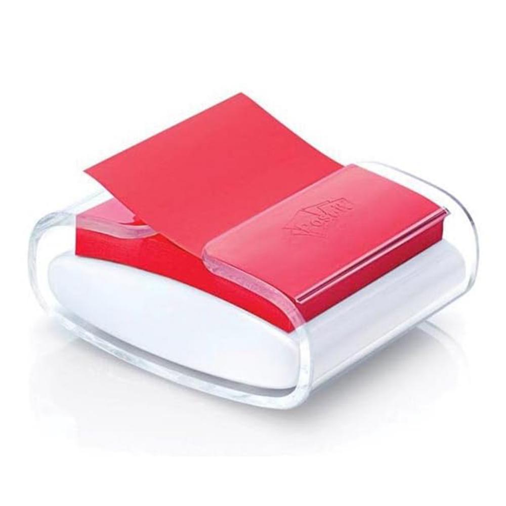 Dispensador de plástico blanco. Medidas: 104 x 85 x 44 mm. Incluye: 12 blocs de Z-Notas Post-it Super Sticky Colores de 90 hojas.
