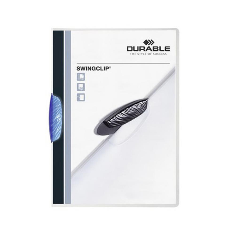 Diseño moderno. Dossier fabricado en polipropileno transparente extrarígido con pinza de plástico de color. Tamaño A4, capacidad 30 hojas. Medidas: 220 x 310 mm. Envase: 25 unidades.