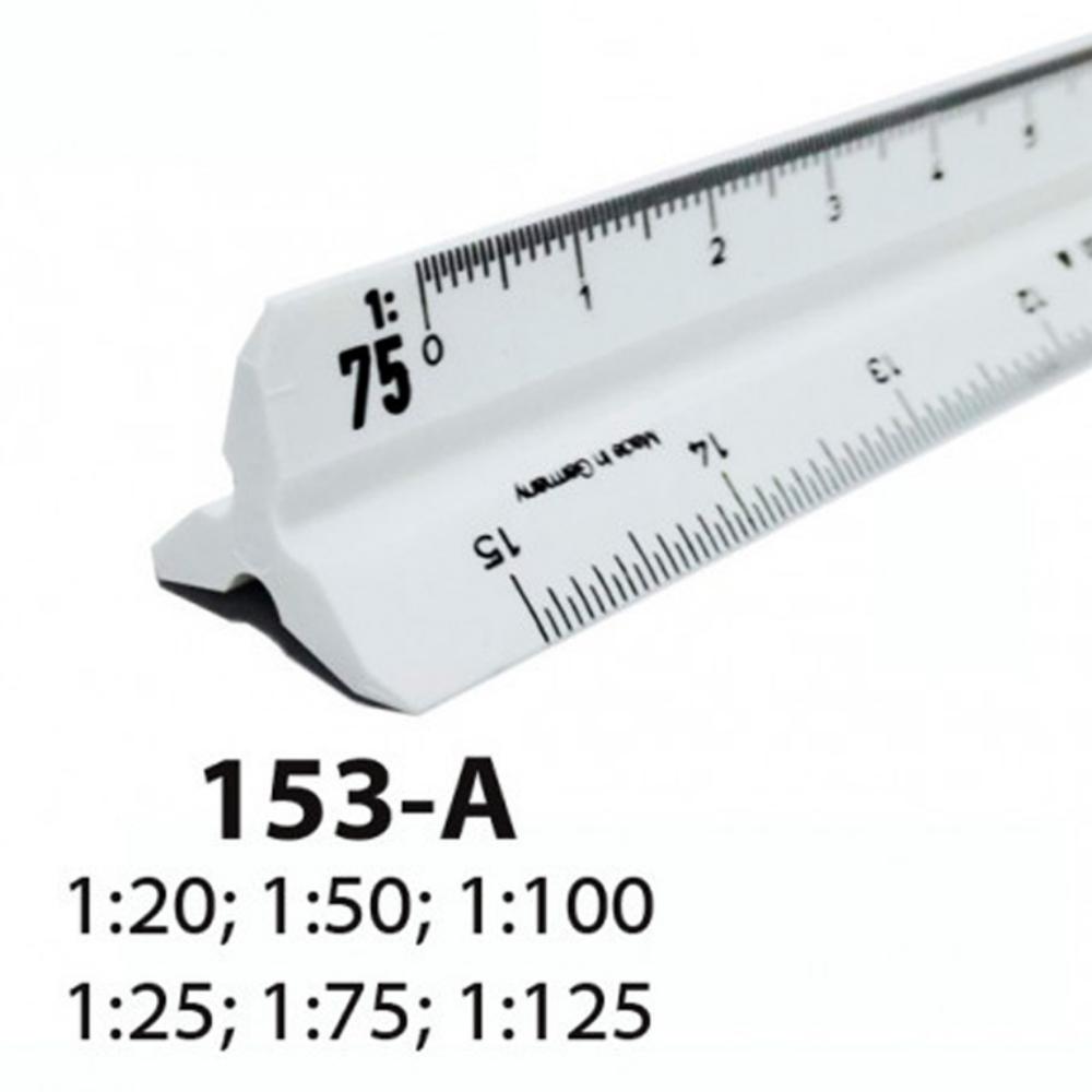 Escalímetro triangular de plástico con funda de plástico. Hendiduras en blanco. 6 divisiones. Longitud: 30 cm. Escala A: 1:20 – 25 – 50 – 75 – 100 – 125. Para uso escolar y profesional.