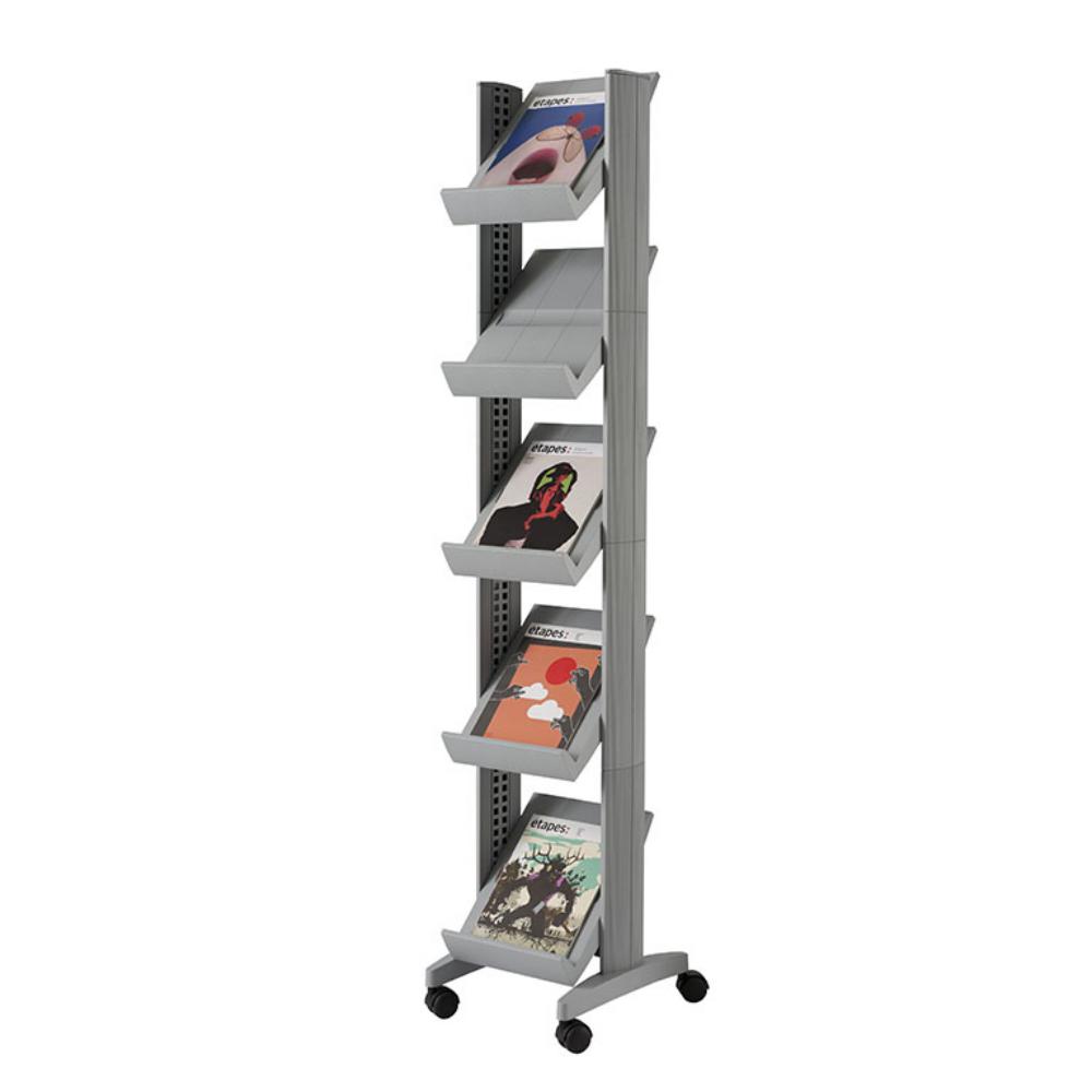 Estructura de poliestireno con refuerzos de metal, soportes y cinco estantes de poliestireno, dimensiones: 275 x 327 mm. Borde de 40 mm. Estantes pivotantes: ángulo 0°, 45°, 75°, ajustables cada 20 mm. Incluye cuatro ruedas giratorias. Medidas: 350 x 1675 x 385 mm. Color plata.