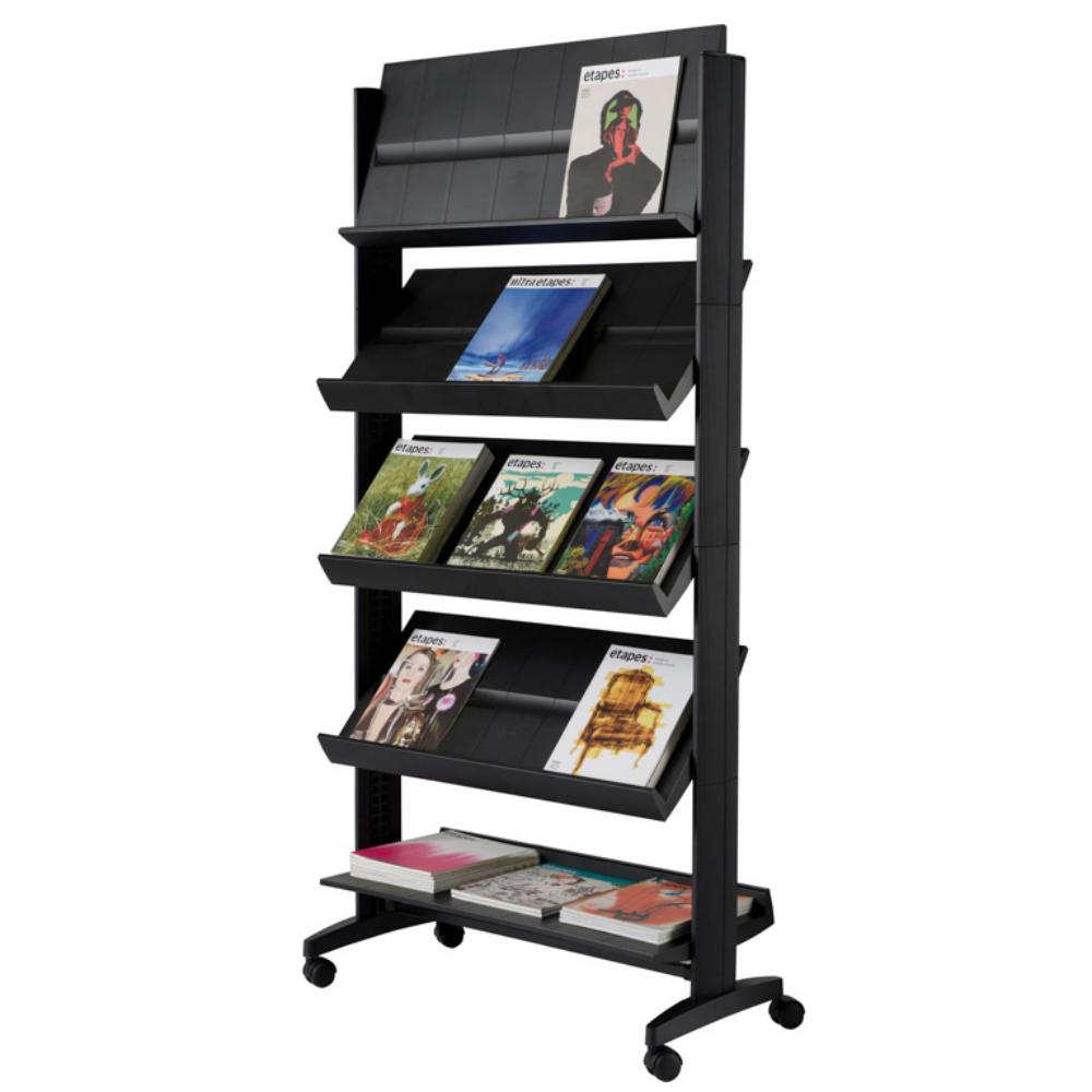 Estructura plástica con refuerzos de metal, soportes y estantes de plástico. 5 estantes dim: An 780 x P. 327mm, borde 40mm. Estantes pivotantes: ángulos de 0º, 45º, 75º. Ajustables cada 20mm. 4 ruedas giratorias. Muy fácil de montar. Dimensiones: 855 (An) x 1675 (Alt) x 385 (Pro).