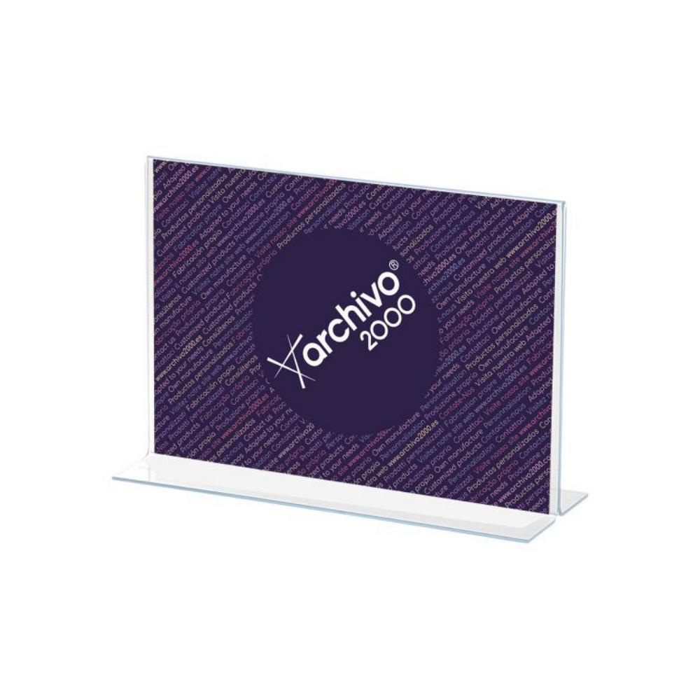 Expositor sobremesa Archivo 2000 en forma de T DIN A4 horizontal fabricado enpoliestireno de gran calidad y resistencia. El documento se introduce por la parte inferior. Amplia base que lo hace muy estable. Medidas exteriores: 90x300x215 mm. Color: cristal transparente.
