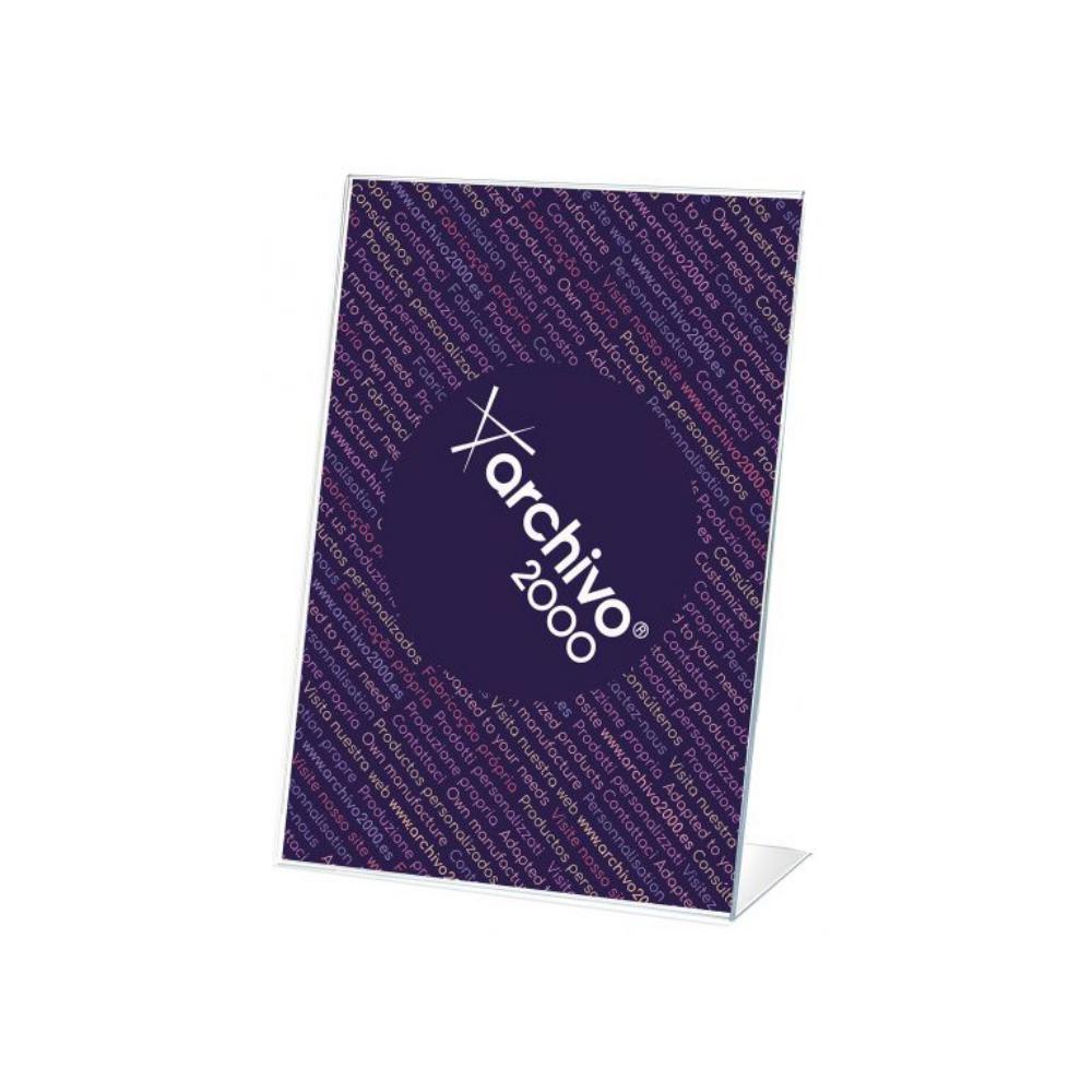 Expositor sobremesa Archivo 2000 en forma de L DIN A6 vertical. Fabricado en poliestireno ultra transparente de gran calidad y resistencia. El documento se desliza lateralmente. Medidas exteriores: 45x105x155 mm.