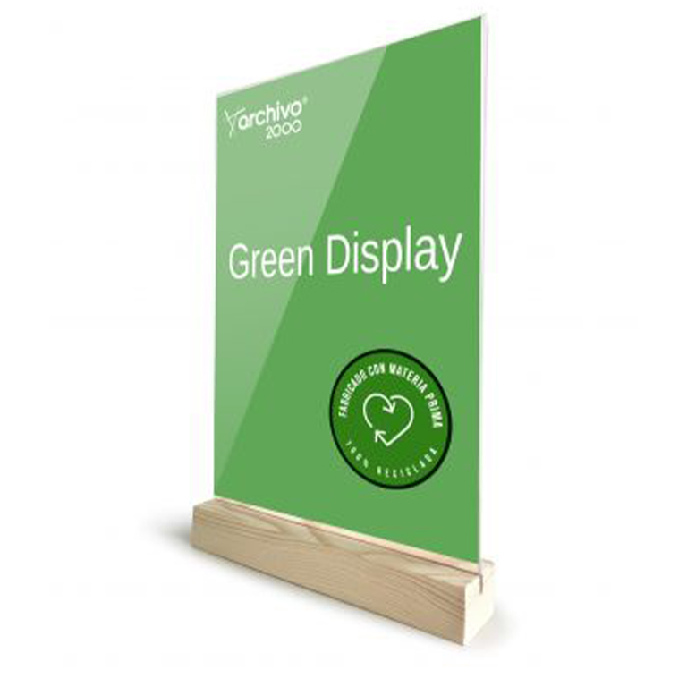 Expositor de sobremesa sostenible Archivo 2000 Green Display con base de madera.Formato DIN A5 vertical. Fabricado en metacrilato 100% reciclado y reciclable ultra transparente resistente y base de madera. Base con acabado lijado y canal pasante, ranura anticaída adaptada a cada formato para una mayor seguridad del documento. Color cristal transparente y madera. Tamaño de la madera 40x150x30 mm. Medidas exteriores: 40x150x240 mm. Fabricado en España.