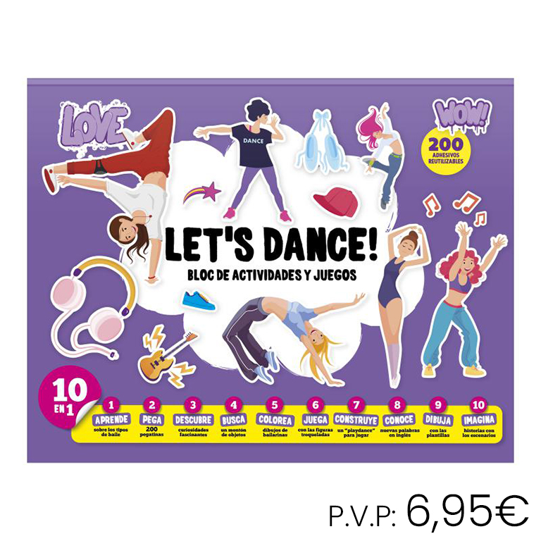 10 en 1. Aprende sobre los tipos de baile, pega 200 pegatinas, descubre curiosidades fascinantes, busca un montón de objetos, colorea dibujos de bailarinas, juega con las figuras troqueladas, construye un playdance para jugar, conoce nuevas palabras en inglés, dibuja con las plantillas e imagina historias con los escenarios.