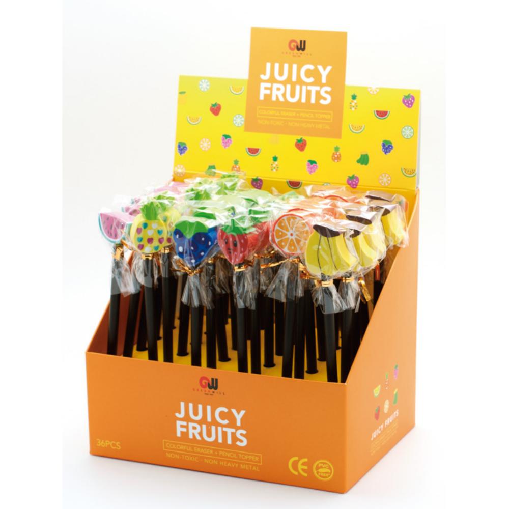 Expositor de 36 divertidos lápices con gomas en varios colores y formas. Lápices con cuerpo de madera negra. Lápices con forma redonda. Seis motivos diferentes de frutas: plátano, sandía, naranja, fresa, piña y mora. No tóxico.