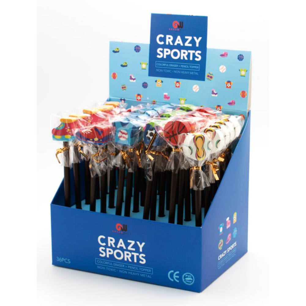 Expositor de 36 divertidos lápices con gomas en varios colores y formas. Lápices con cuerpo de madera negra. Lápices con forma redonda. Seis motivos diferentes de deportes: patín, zapatilla, camiseta baisbol, camiseta fútbol, pelota de baloncesto y pelota. No tóxico.
