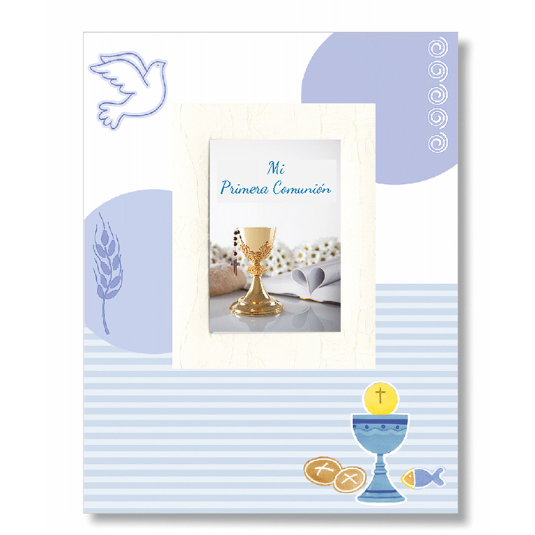 Libro de Comunión de lomo ancho azul. Encuadernado con marco para la foto y estampación en azul brillante. Con 18 hojas impresas a color y hojas en blanco para fotos y recuerdos. Con estuche tamaño 34x28cm