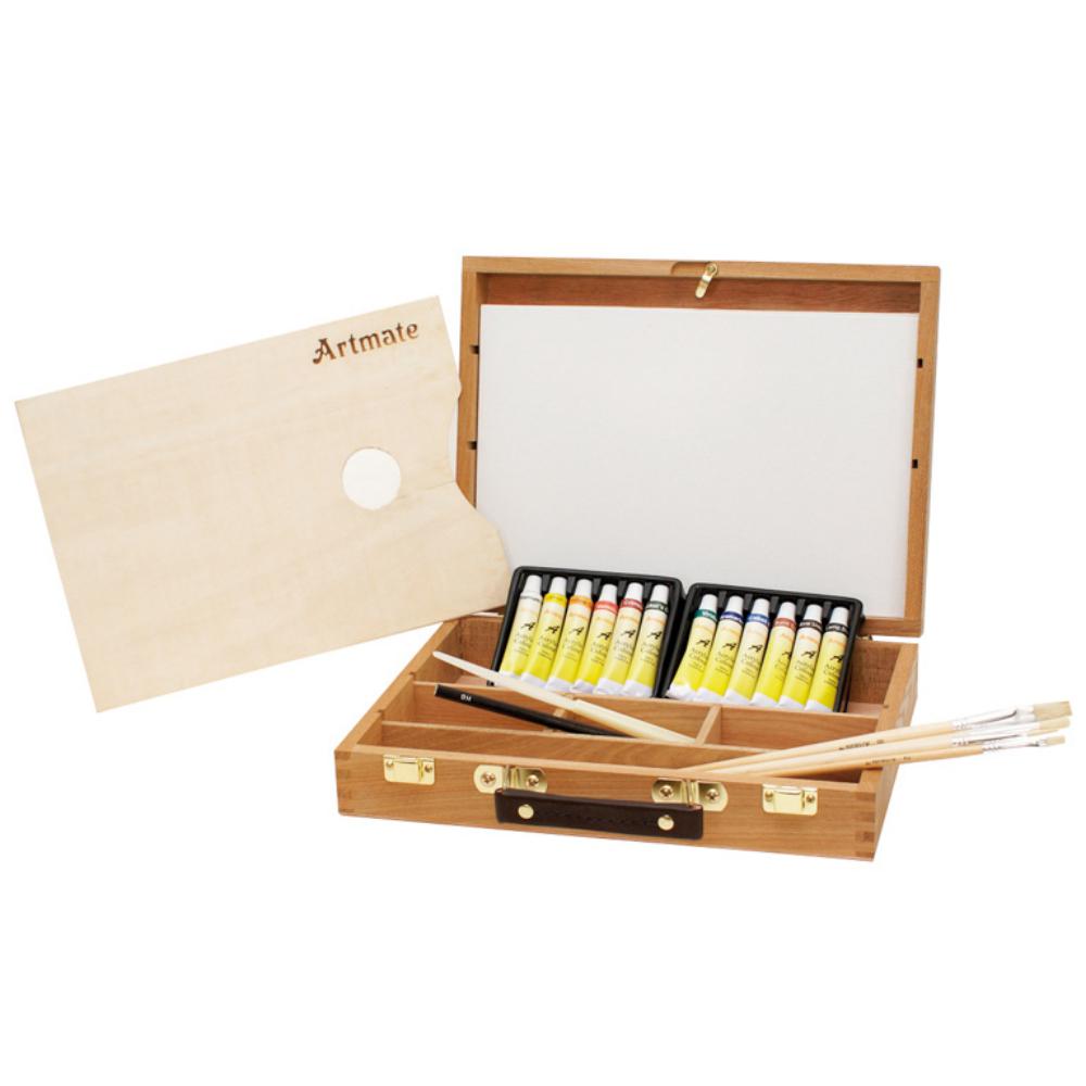Maletín de madera. Maletín con todo lo básico para la iniciación a la pintura. Contiene: 3 tablillas enteladas de 20×30 cm, 12 tubos de colores acrílicos, 4 pinceles Nº 2, 4, 6 y 8. 1 lápiz de mina HB, 1 espátula cortante de plástico y 1 paleta de madera de 20 x 30 cm. Medidas: 32 x 24 x 7,2 cm.