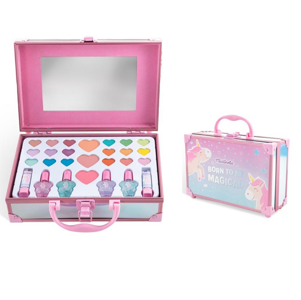 Maletín de maquillaje Little Unicorn de Martinelia. Contiene: 18 sombras de ojosde colores surtidos, 4 esmaltes de uñas con purpurina, 3 coloretes y 2 pintalabios, con espejo incluido. Medidas 7 x 28 x 24,5 cm. Los productos Martinelia están especialmente diseñados para niños, no contienen químicos ni parabenos y se pueden retirar con agua tibia. Edad +3 años.