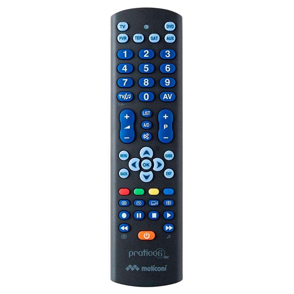 Mando a distancia universal pre-programado, ideal para sustituir y agrupar hasta 6 mandos a elección entre: TV (CRT, LCD, Plasma, LED), decodificador digital terrestre, decodificador satelital, Canal Plus, decodificador por cable e IPTV, DVD, Blu Ray, PVR, multimedia player, PS2, Xbox360. Utiliza 2 pilas tipo AA. Color: negro.