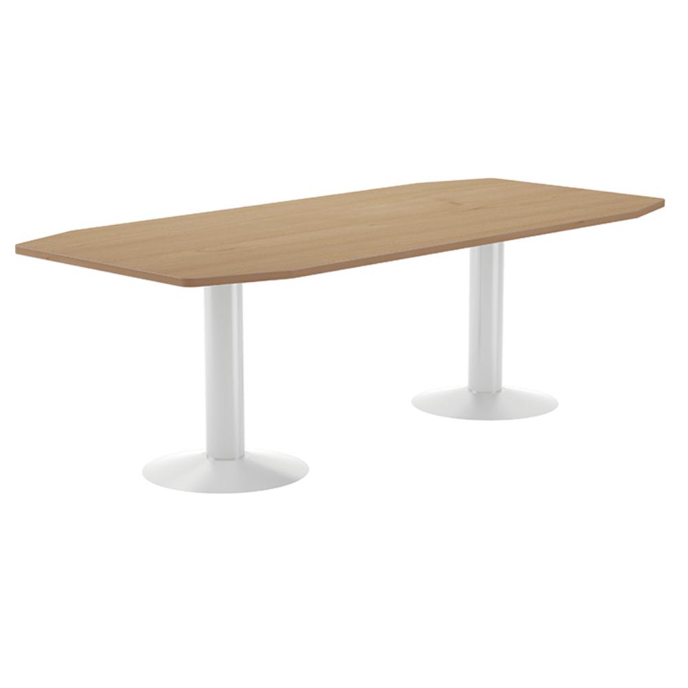 La serie Meeting se integra en los espacios de reunión de forma simple, funcional y práctica. Dos patas en tubo de acero con base de acero estampado para mayor estabilidad. Forma rectangular. Estructura metálica realizada en tubo de acero con base de acero de gran estabilidad. Tablero melamínica con sistema de regulación independiente (20 mm). Melamínico sobre aglomerado de 25 mm de grosor con canto de PVC de 2 mm de grosor. Forma rectangular. Color de la estructura: blanco. Color del tablero: roble. Medidas: 220 x 100 x 72 cm.