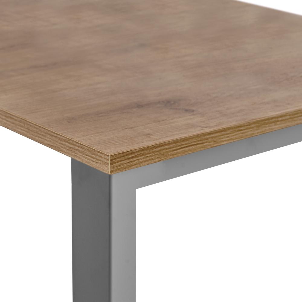 Mesa de trabajo de la línea Total. Superficie de mesa: cristal templado de 10 mm de grosor. Melamínico sobre aglomerado de 25 mm de grosor con canto de PVC de 2 mm de grosor. Estructura con sistema de regulación independiente (50 mm) fabricada en tubo de acero. Travesaños tubulares de acero con nuevas medidas reducidas de 30 x 30 mm para una máxima comodidad. Sistema de fijación del tablero mediante una pieza de polímero técnico. Medidas del tablero: 160 x 80 cm. Color de la estructura: aluminio. Color del tablero: roble.