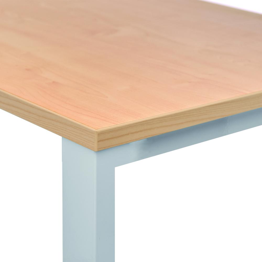 Mesa de trabajo de la línea Total. Superficie de mesa: cristal templado de 10 mm de grosor. Melamínico sobre aglomerado de 25 mm de grosor con canto de PVC de 2 mm de grosor. Estructura con sistema de regulación independiente (50 mm) fabricada en tubo de acero. Travesaños tubulares de acero con nuevas medidas reducidas de 30 x 30 mm para una máxima comodidad. Sistema de fijación del tablero mediante una pieza de polímero técnico. Medidas del tablero: 180 x 80 cm. Color de la estructura: blanco. Color del tablero: haya.