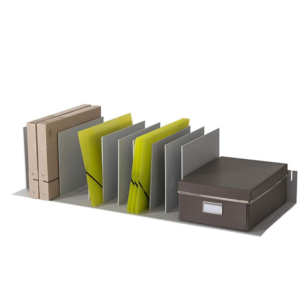 Organizador de escritorio vertical individualizado de 10 separadores ajustables. Color gris. Fabricado en poliestireno duradero. Se adapta a carpetas y archivos de diferentes tamaños. Medidas (ancho x alto x largo): 22 x 27,5 x 85,7 cm. Separadores ajustables cada 2,5 cm.